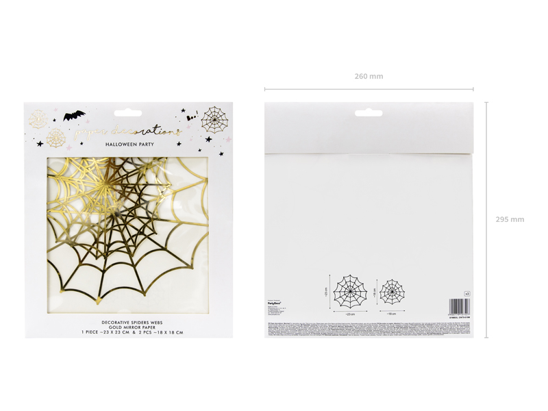 Dekoracje papierowe w kształcie pajęczyn w kolorze złotym lustrzanym,wymiary: ok. 23 x 23 cm (1 szt.) i ok. 18 x 18 cm (2 szt.). (1 op. / 3 szt.)