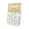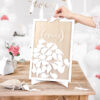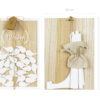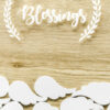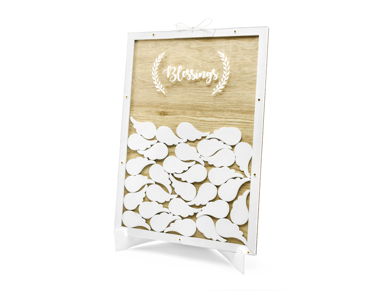 Drewniana księga gości z białym napisem Blessings, zestaw zawiera prostokątną księgę w oraz 30 białych skrzydełek do wypisania, wymiary ok. 27,5 x 39,5 cm.