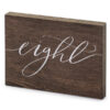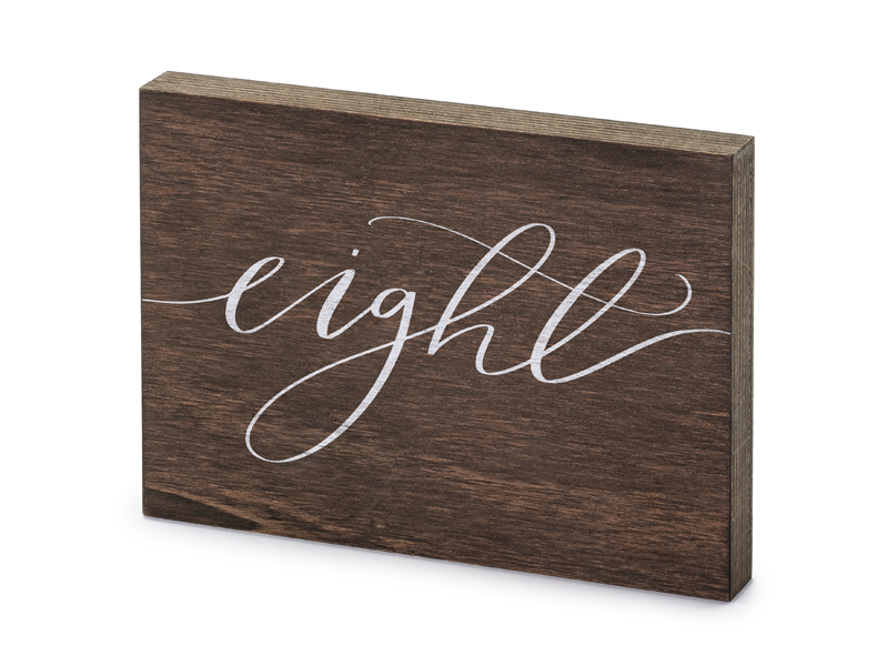 Drewniany numer na stół z białym napisem „Eight”