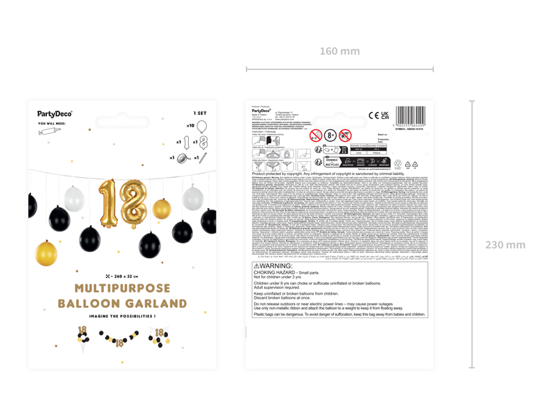 Girlanda balonowa 3 w 1 – 18 urodziny w kolorze czarno-złoto-białym, zestaw zawiera: balony lateksowe (10 szt.), balony foliowe (2 szt.), wstążkę (25 m) i słomkę papierową. Wymiary po złożeniu ok. 260 x 32 cm. Girlanda posiada 3 opcje złożenia, instrukcja w zestawie.