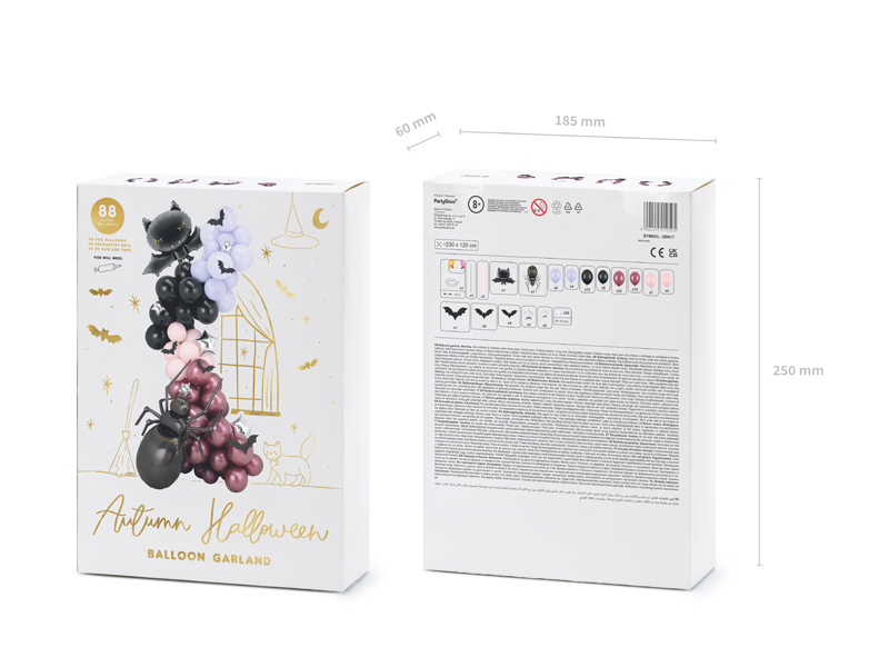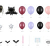Girlanda balonowa Halloween, mix kolorów, zestaw zawiera: balony lateksowe (88 szt.), balony modeliny (3 szt.), balony foliowe (7 szt.), papierowe nietoperze (7 szt.), taśmę piankową (20 szt.), słomkę papierową, 5 m taśmy do girland, Wymiary ok. 210 x 120 cm. Instrukcja w zestawie.