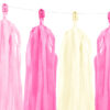 Girlanda frędzle, do samodzielnego złożenia, zestaw zawiera 12 frędzli (po 4 x kremowy, różowy i ciemnoróżowy) i ok. 2 m białego sznurka, wymiary po złożeniu: wysokość ok. 30 cm, długość ok. 1,5 m.