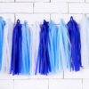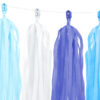 Girlanda frędzle, do samodzielnego złożenia, zestaw zawiera 12 frędzli (po 3x biały, niebieski, błękitny, granatowy) i ok. 2 m białego sznurka, wymiary po złożeniu: wysokość ok. 30 cm, długość ok. 1,5 m.