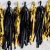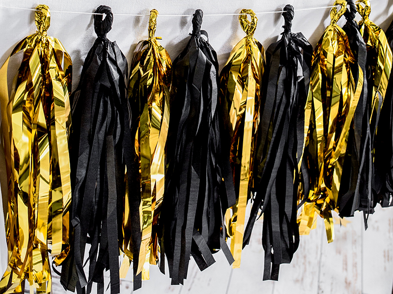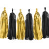 Girlanda frędzle, do samodzielnego złożenia, zestaw zawiera 12 frędzli (po 6 x złoty lustrzany, czarny) i ok. 2 m białego sznurka, wymiary po złożeniu: wysokość ok. 30 cm, długość ok. 1,5 m.