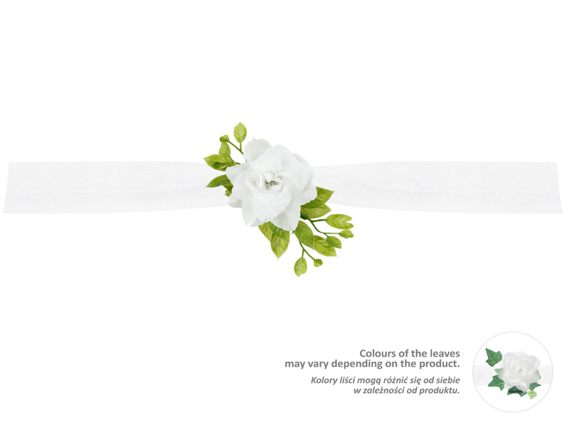 Girlanda z tiulu w kolorze białym, z białymi różyczkami i zielonymi listkami, długość 1,70 metra.