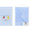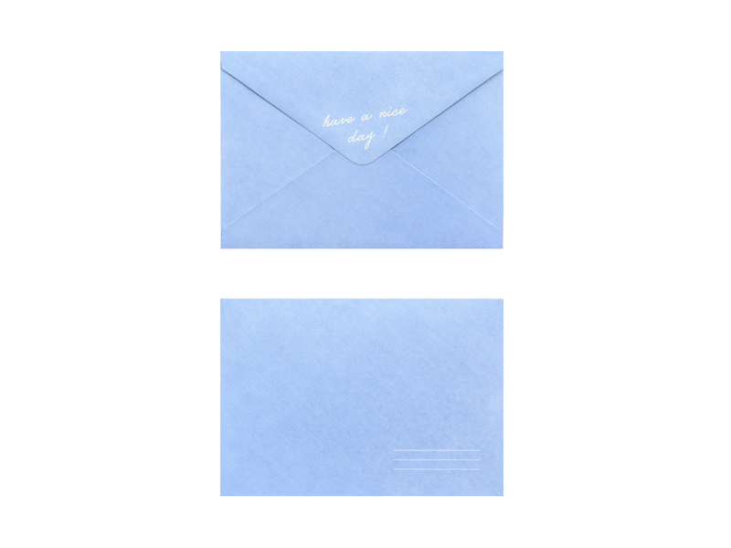 Kartka w niebieskim kolorze z napisem ”Have a nice day!” i dwoma bransoletkami oraz niebieską kopertą z kolorowym nadrukiem, wymiary kartki ok. 10.5 x 14.8 cm.