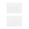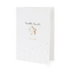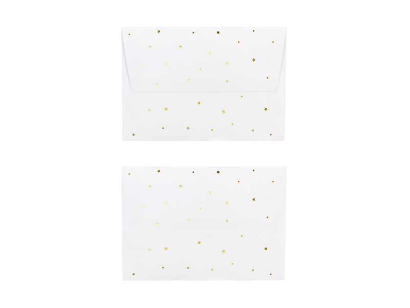 Kartka w białym kolorze ze złotym metalizowanym nadrukiem z pinem w kształcie gwiazdki i białą kopertą ze złotym metalizowanym nadrukiem, wymiary kartki ok. 10.5 x 14.8 cm, wymiary pina ok. 2.5 x 2.5 cm.