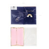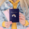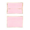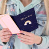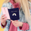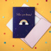 Kartka w granatowym kolorze ze złotym metalizowanym nadrukiem z pinem w kształcie tęczy i różową kopertą ze złotym metalizowanym nadrukiem, wymiary kartki ok. 10.5 x 14.8 cm, wymiary pina ok. 4.5 x 2.5 cm.