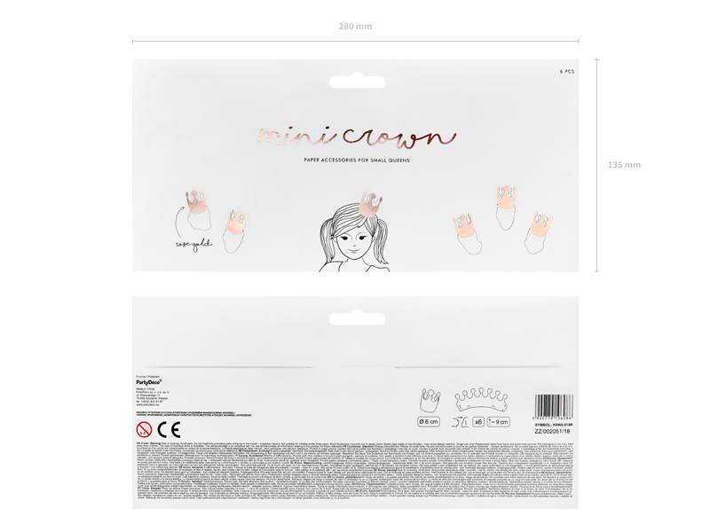 Korona Party wykonana z papieru lustrzanego w kolorze różowego złota, wymiary po złożeniu: wysokość ok. 9 cm, średnica ok. 6 cm. (1 op. / 6 szt.)