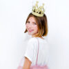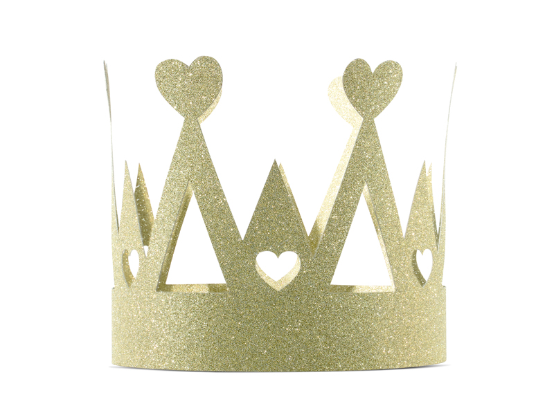 Korona Sweet Love wykonana z papieru brokatowego w kolorze złotym, wymiary po złożeniu: wysokość ok. 10 cm, średnica ok. 11 cm
