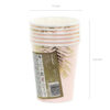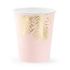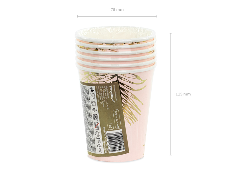Kubeczki papierowe w kolorze jasnoróżowym ze złotym wzorem liści, pojemność ok 220 ml. Kubki na napoje zawierają oznaczenia wymagane przez Rozporządzenie wykonawcze Komisji (UE) 2020/2151 z dnia 17 grudnia 2020 r. ustanawiające zasady dotyczące zharmonizowanych specyfikacji w odniesieniu do oznakowania produktów jednorazowego użytku z tworzyw sztucznych wymienionych w części D załącznika do dyrektywy Parlamentu Europejskiego i Rady (UE) 2019/904 w sprawie zmniejszenia wpływu niektórych produktów z tworzyw sztucznych na środowisko. Produkt zawiera etykietę wyłącznie w języku polskim, niemieckim, czeskim, francuskim, niderlandzkim, słowackim, słoweńskim i bułgarskim. (1 op. / 6 szt.)