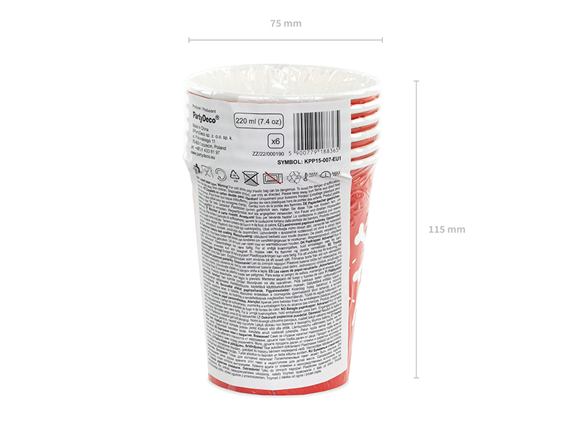 Kubeczki papierowe Piraci w kolorze czerwonym z biały nadrukiem, pojemność ok. 220 ml. Kubki na napoje zawierają oznaczenia wymagane przez Rozporządzenie wykonawcze Komisji (UE) 2020/2151 z dnia 17 grudnia 2020 r. ustanawiające zasady dotyczące zharmonizowanych specyfikacji w odniesieniu do oznakowania produktów jednorazowego użytku z tworzyw sztucznych wymienionych w części D załącznika do dyrektywy Parlamentu Europejskiego i Rady (UE) 2019/904 w sprawie zmniejszenia wpływu niektórych produktów z tworzyw sztucznych na środowisko. Produkt zawiera etykietę wyłącznie w języku polskim, niemieckim, czeskim, francuskim, niderlandzkim, słowackim, słoweńskim i bułgarskim. (1 op. / 6 szt.)