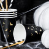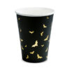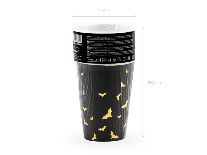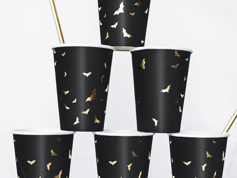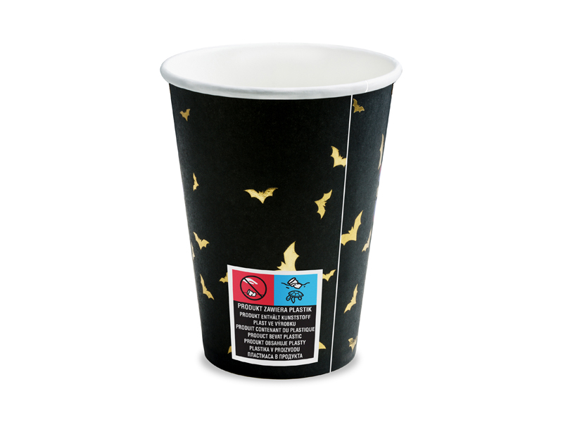Kubeczki papierowe Trick or Treat w kolorze czarnym ze złotym wzorem, pojemność ok. 220 ml. Kubki na napoje zawierają oznaczenia wymagane przez Rozporządzenie wykonawcze Komisji (UE) 2020/2151 z dnia 17 grudnia 2020 r. ustanawiające zasady dotyczące zharmonizowanych specyfikacji w odniesieniu do oznakowania produktów jednorazowego użytku z tworzyw sztucznych wymienionych w części D załącznika do dyrektywy Parlamentu Europejskiego i Rady (UE) 2019/904 w sprawie zmniejszenia wpływu niektórych produktów z tworzyw sztucznych na środowisko. Produkt zawiera etykietę wyłącznie w języku polskim, niemieckim, czeskim, francuskim, niderlandzkim, słowackim, słoweńskim i bułgarskim. (1 op. / 6 szt.)