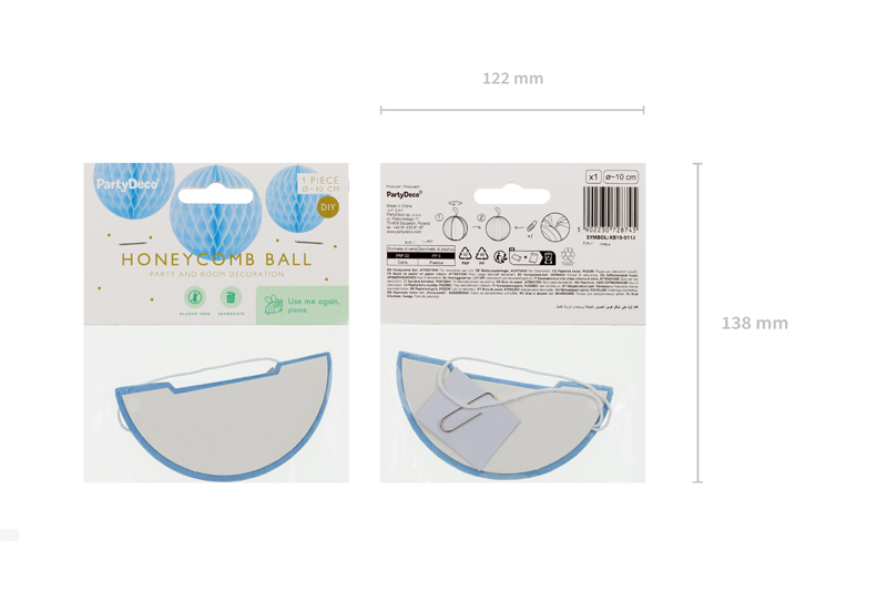 Kula bibułowa w kolorze jasnobłękitnym o średnicy około 10 centymetrów. Produkt wielokrotnego użytku. Montaż przy pomocy spinacza.