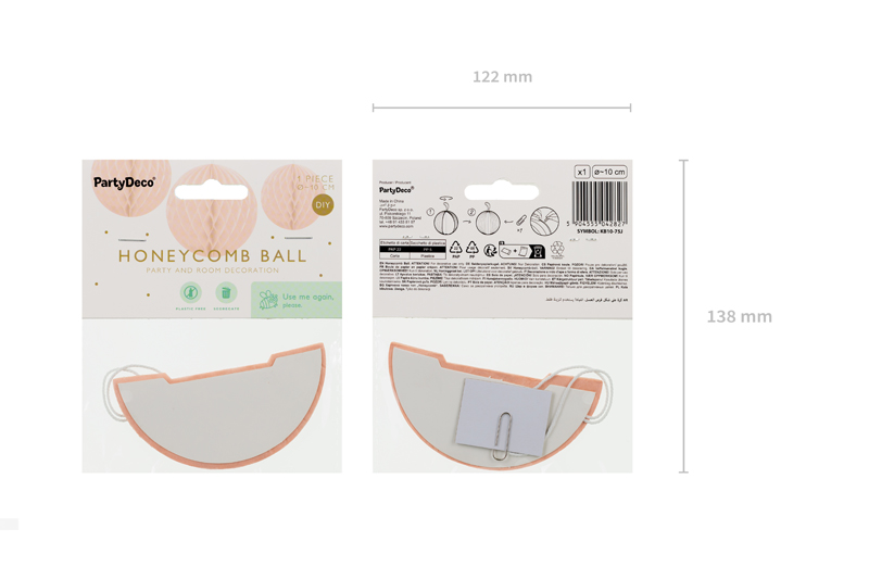 Kula bibułowa w kolorze jasnobrzoskwiniowym o średnicy około 10 cm. Produkt wielokrotnego użytku. Montaż przy pomocy spinacza.