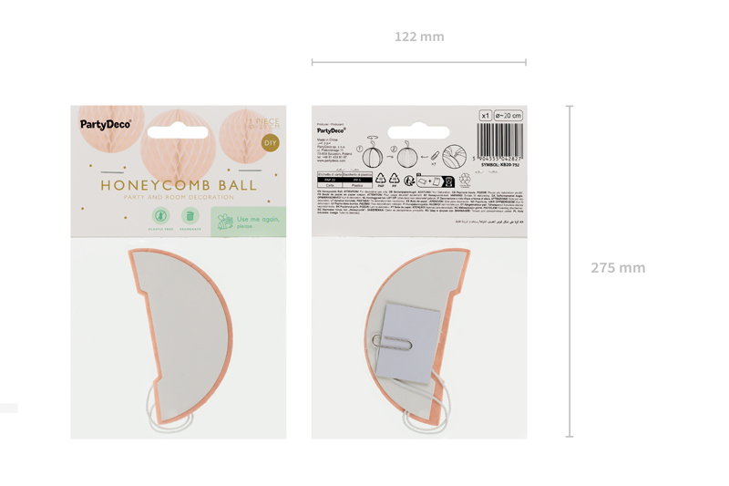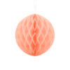 Kula bibułowa w kolorze jasnobrzoskwiniowym o średnicy około 20 centymetrów. Produkt wielokrotnego użytku. Montaż przy pomocy spinacza.