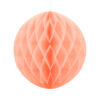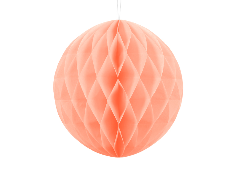 Kula bibułowa w kolorze jasnobrzoskwiniowym o średnicy około 30 centymetrów. Produkt wielokrotnego użytku. Montaż przy pomocy spinacza.