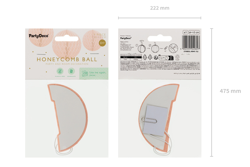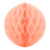 Kula bibułowa w kolorze jasnobrzoskwiniowym o średnicy około 40 centymetrów. Produkt wielokrotnego użytku. Montaż przy pomocy spinacza.