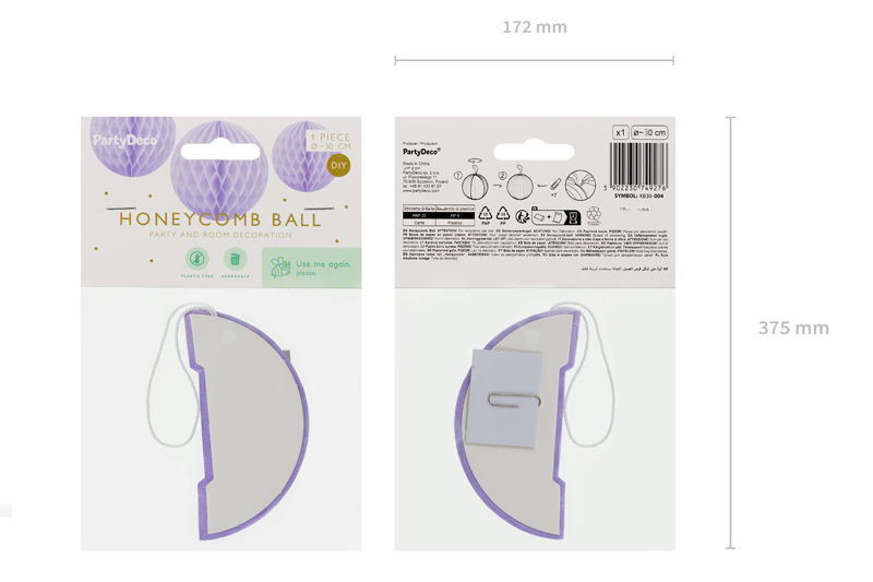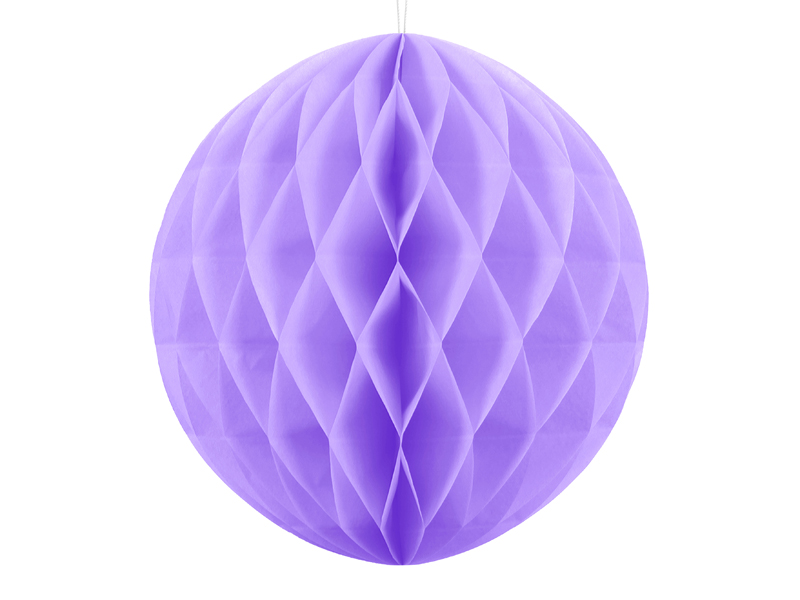 Kula bibułowa w kolorze liliowym o średnicy ok. 30 cm. Produkt wielokrotnego użytku. Montaż przy pomocy spinacza.