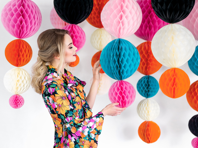 Kula bibułowa w kolorze pomarańczowym o średnicy około 10 centymetrów. Produkt wielokrotnego użytku. Montaż przy pomocy spinacza.