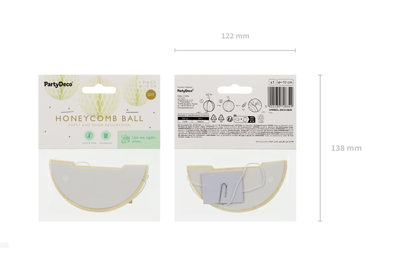 Kula bibułowa w kolorze słomkowym o średnicy około 10 centymetrów. Produkt wielokrotnego użytku. Montaż przy pomocy spinacza.