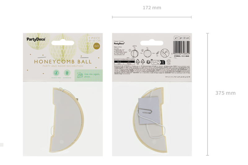 Kula bibułowa w kolorze słomkowym o średnicy około 30 centymetrów. Produkt wielokrotnego użytku. Montaż przy pomocy spinacza.