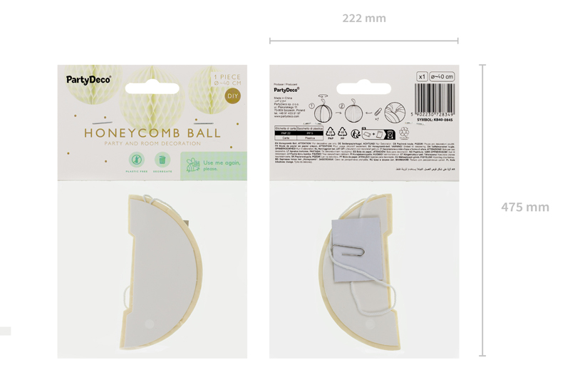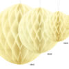 Kula bibułowa w kolorze słomkowym o średnicy około 40 centymetrów. Produkt wielokrotnego użytku. Montaż przy pomocy spinacza.
