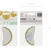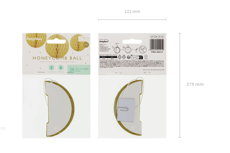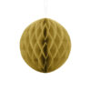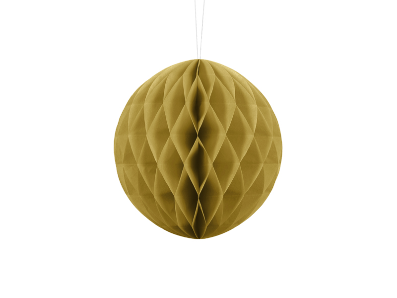 Kula bibułowa w kolorze złotym o średnicy około 20 centymetrów. Produkt wielokrotnego użytku. Montaż przy pomocy spinacza.