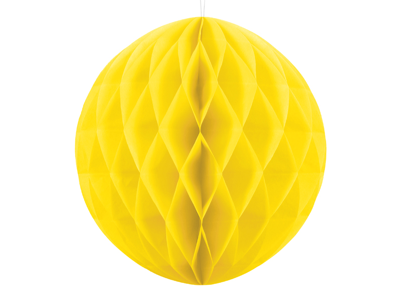 Kula bibułowa w kolorze żółtym o średnicy około 20 centymetrów.