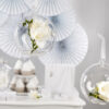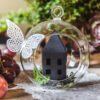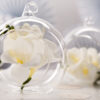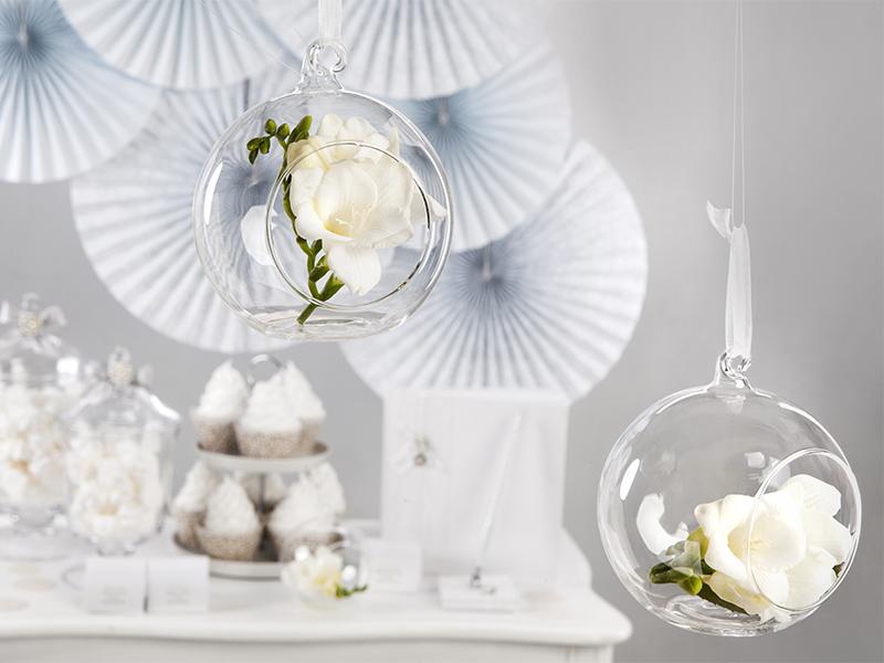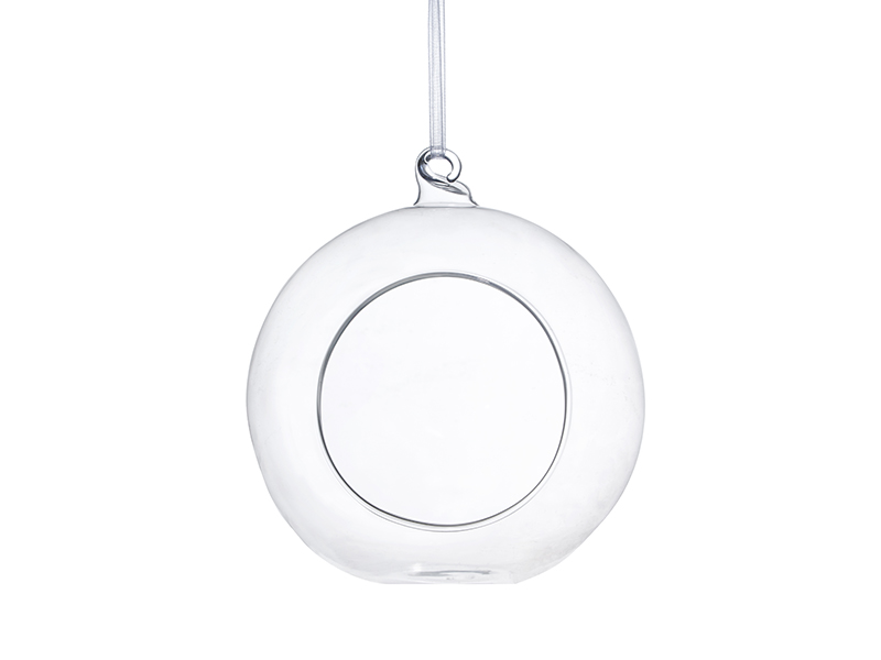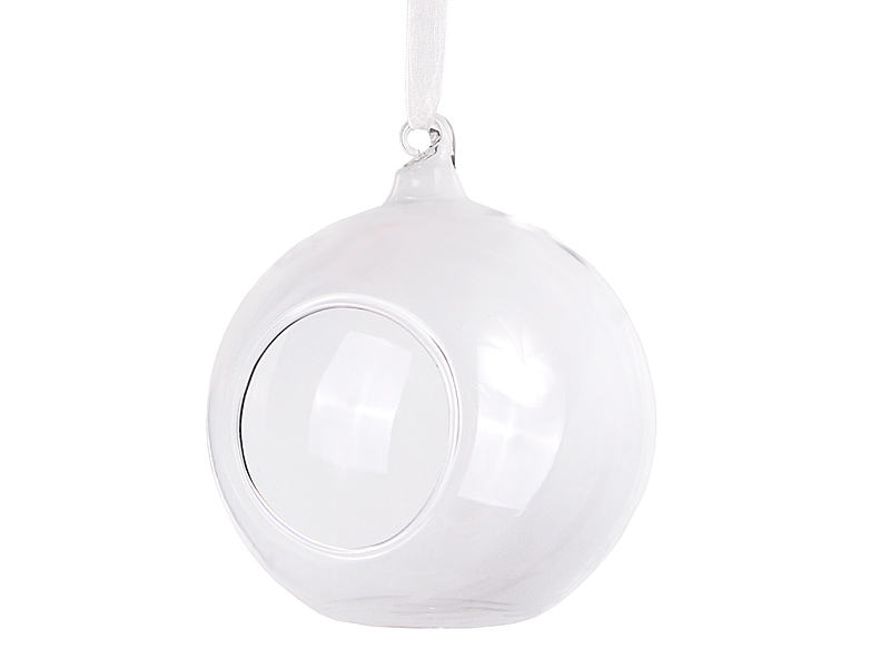Kule szklane ze wstążką, średnica 10 centymetrów, średnica otworu ok. 5,5 centymetra, długość wstążki około 7,5 centymetra. (1 op. / 4 szt.)
