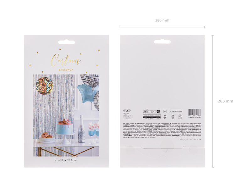 Kurtyna Party w kolorze holograficznym, szerokość ok. 90 cm, wysokość ok. 250 cm.