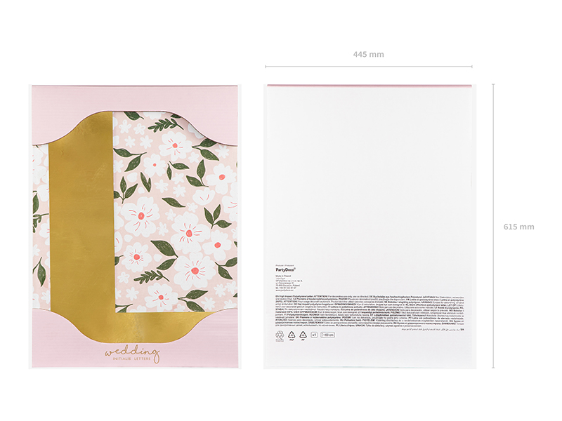 Litera lustrzana ”L” wykonana z hipsu w kolorze złotym, wymiary litery ok. 37×60 cm