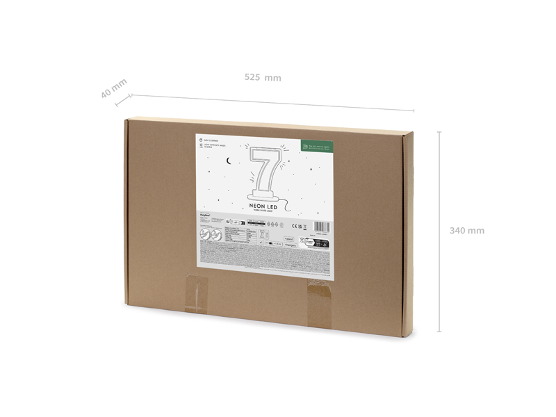 Neon LED – Cyfra ”7” w kolorze białym na przeźroczystym tle o ciepłej białej barwie światła, wysokość ok. 50 cm, długość kabla z wtyczką ok. 1,5 m. Możliwość regulacji intensywności świecenia. Zestaw zawiera NEON, podstawkę do postawienia cyfry i wieszak do mocowania na ścianie. Moc znamionowa: 8-10W, napięcie znamionowe: 5V, rodzaj wtyczki: USB.