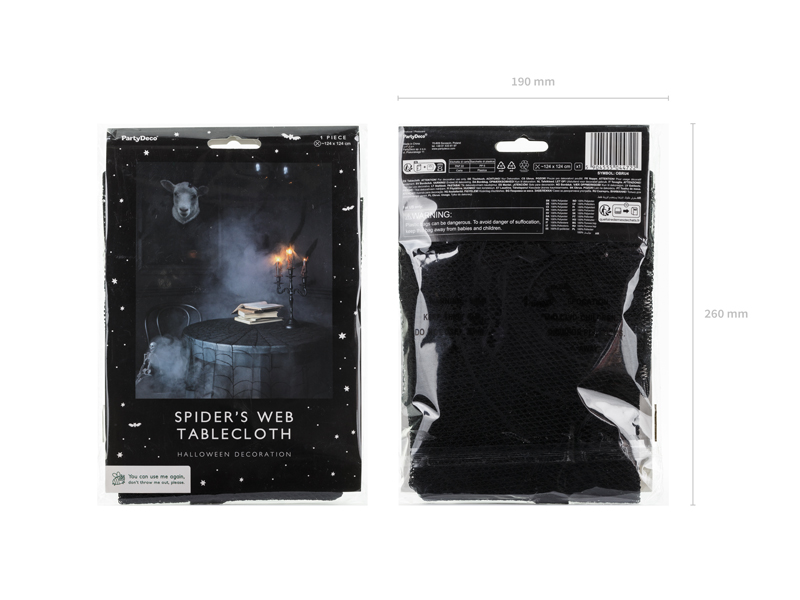 Obrus jednostronny Pajęczyna w kolorze czarno-szarym, średnica ok. 124 cm. Skład: poliester – 100%. Sposób konserwacji: prać ręcznie.