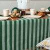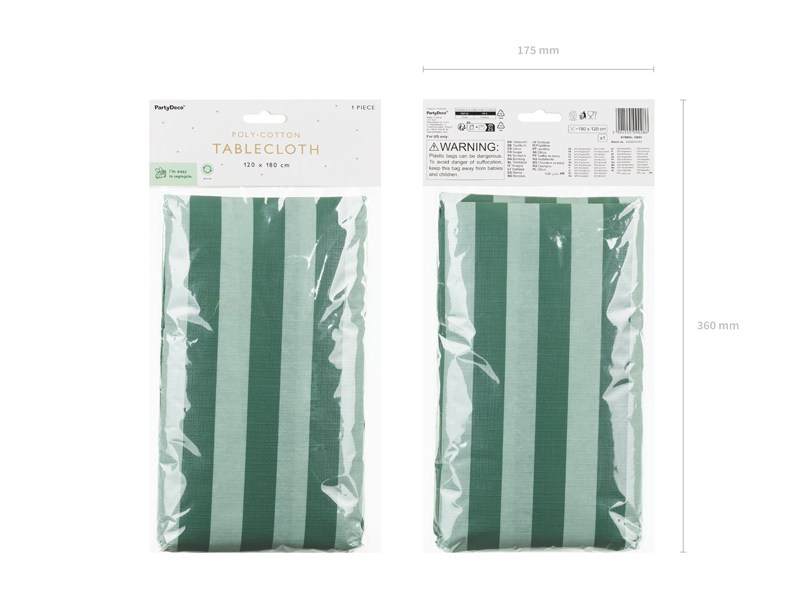 Jednorazowy, jednostronny, prostokątny obrus o wymiarach 180 x 120 cm w zielone paski ze złotym nadrukiem strzemion. Obrus wykonany z materiału syntetycznego.