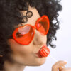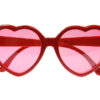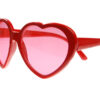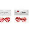 Okulary Serduszka w kolorze czerwonym, wymiary: szerokość oprawki 14 centymetrów, wysokość oprawki 6 centymetrów, długość zausznika 13 centymetrów.