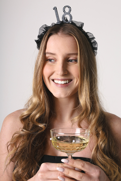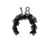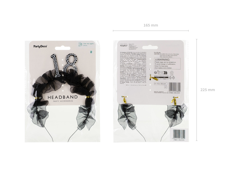 Opaska z czarną, materiałową falbanką oraz liczbą 18 udekorowaną perełkami. Rozmiar całościowy ok 12 x 19,5 cm. Wysokość samej liczby ok. 5,3 cm