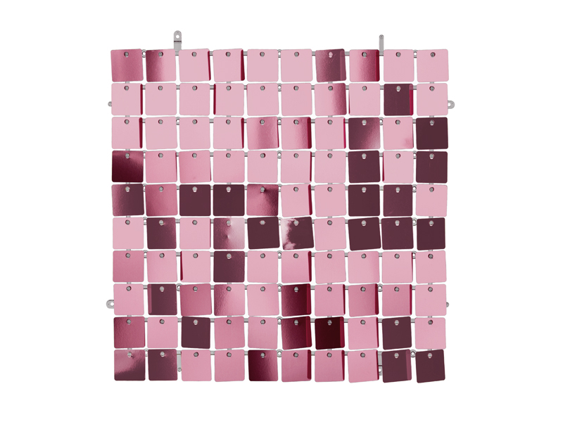 Panel cekinowy, cekiny w kształcie kwadratów, w kolorze jasnego różu, wymiar ok. 30×30 cm. Panele cekinowe posiadają zatrzaski na bokach, które umożliwiają łączenie paneli kwadratowych w spójną całość – patrz instrukcja na karcie produktu. Połączone panele idealnie pasują na stojak SNT5-150-019, które można zamontować używając żyłki. Panele tworzą niesamowity efekt dzięki blaszkom, które ruszają się wskutek ruchu powietrza.