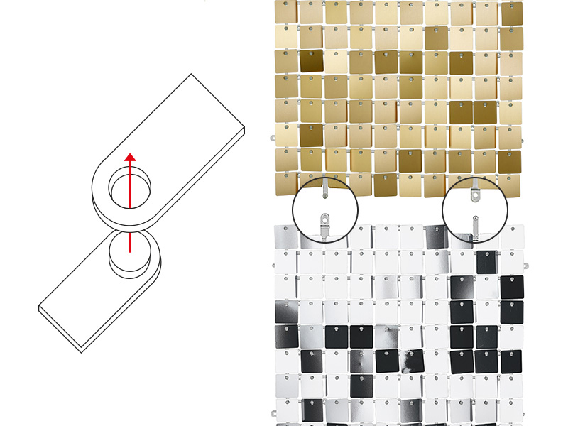 Panel cekinowy, cekiny w kształcie kwadratów, w kolorze jasnego złota, wymiar ok. 30×30 cm. Panele cekinowe posiadają zatrzaski na bokach, które umożliwiają łączenie paneli kwadratowych w spójną całość – patrz instrukcja na karcie produktu. Połączone panele idealnie pasują na stojak SNT5-150-019, które można zamontować używając żyłki. Panele tworzą niesamowity efekt dzięki blaszkom, które ruszają się wskutek ruchu powietrza.