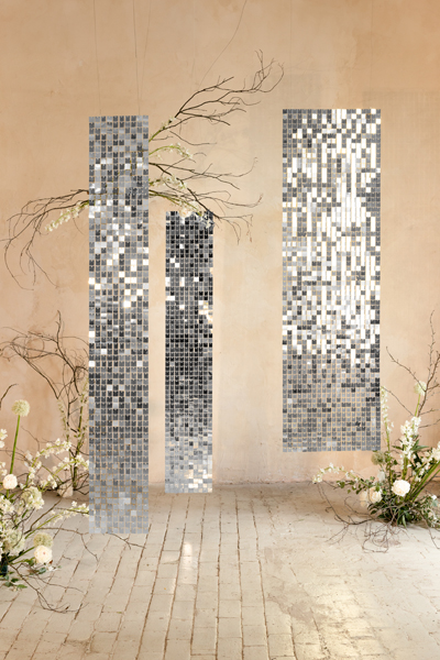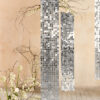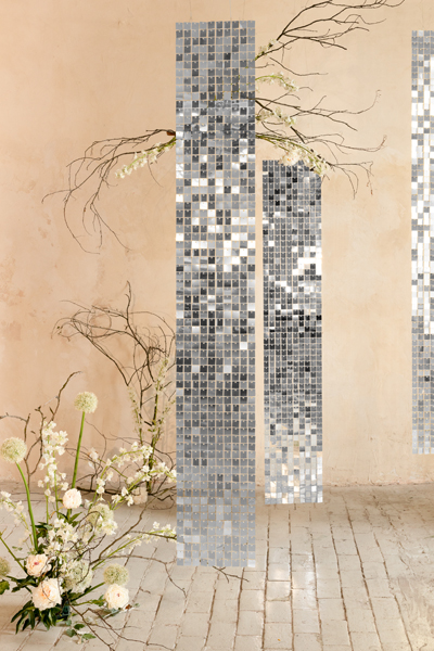 Panel cekinowy, cekiny w kształcie kwadratów, w kolorze srebrnym, wymiar ok. 30×30 cm. Panele cekinowe posiadają zatrzaski na bokach, które umożliwiają łączenie paneli kwadratowych w spójną całość – patrz instrukcja na karcie produktu. Połączone panele idealnie pasują na stojak SNT5-150-019, które można zamontować używając żyłki. Panele tworzą niesamowity efekt dzięki blaszkom, które ruszają się wskutek ruchu powietrza.