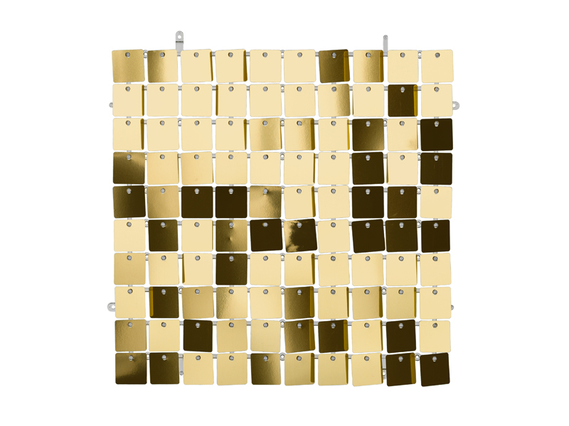 Panel cekinowy, cekiny w kształcie kwadratów, w kolorze zimnego złota, wymiar ok. 30×30 cm. Panele cekinowe posiadają zatrzaski na bokach, które umożliwiają łączenie paneli kwadratowych w spójną całość – patrz instrukcja na karcie produktu. Połączone panele idealnie pasują na stojak SNT5-150-019, które można zamontować używając żyłki. Panele tworzą niesamowity efekt dzięki blaszkom, które ruszają się wskutek ruchu powietrza.