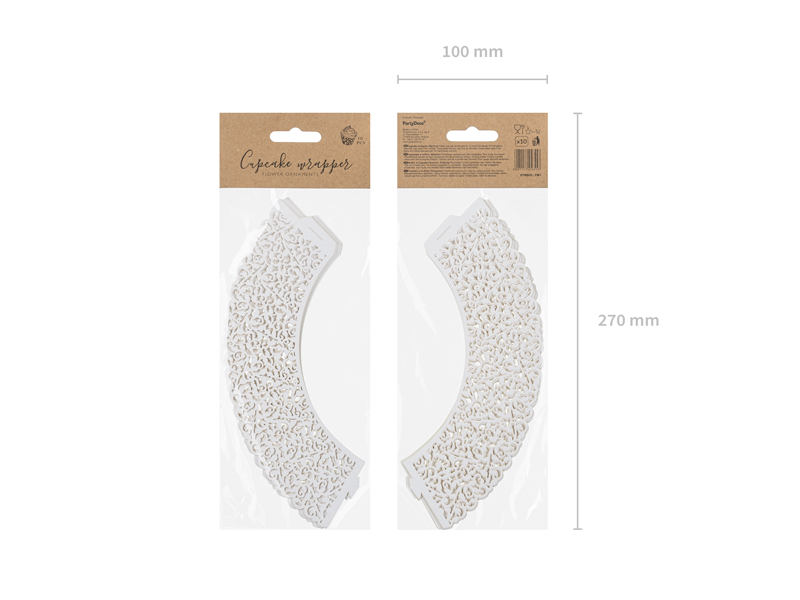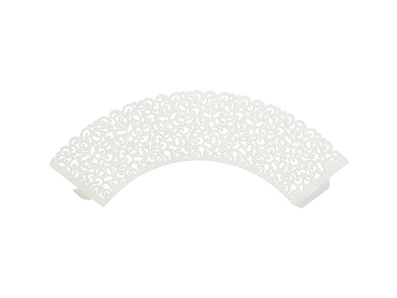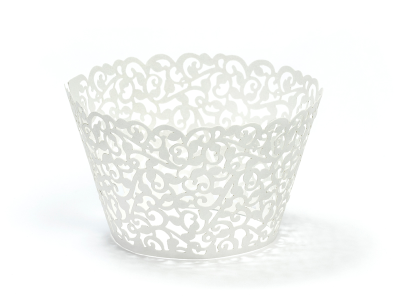 Papilotki na muffinki w kolorze białym, z wyciętym ornamentem, wymiary 5,5×8,5 centymetra. (1 op. / 10 szt.)