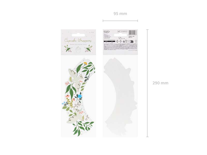 Papilotki na muffinki Kwiaty wykonane z papieru w kolorze białym z kolorowym nadrukiem, wymiary po złożeniu ok. 5 x 7.5 x 6.5 cm (1 op. / 6 szt.)
