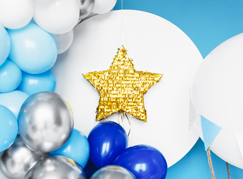 Piniata w kształcie gwiazdy w kolorze metalizowanym złotym, do wypełnienia upominkami, wymiary ok. 44.5 x 42.5 x 9 cm.