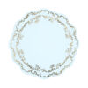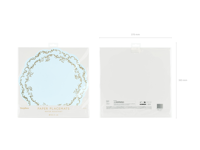 Jednostronne podkładki pod talerze ze złotym Ornamentem w kolorze błękitnym. Średnica ok. 35,5 cm. Zestaw zawiera 6 podkładek. Produkt jednorazowego użytku. Wykonane z wodoodpornego syntetycznego papieru. (1 op. / 6 szt.)