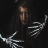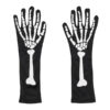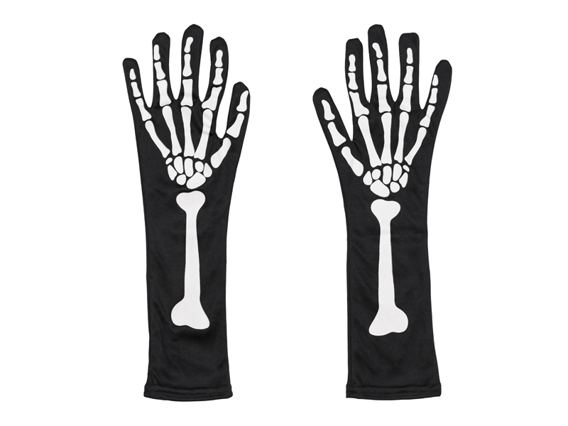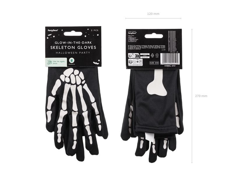 Rękawice świecące w ciemności, w kolorze czarnym z motywem ręki kościotrupa o rozmiarze S/M, długość ok. 39.5 cm, obwód ok. 30 cm. Skład: poliester – 100%. Sposób konserwacji: prać ręcznie.