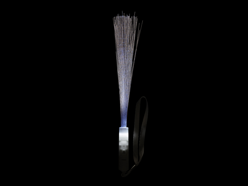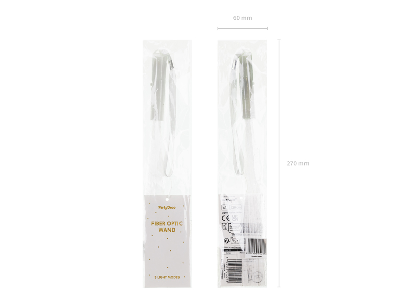 Różdżka światłowodowa LED w kolorze białym, długość 26 cm. Różdżka emituje białe światło i posiada 3 tryby świecenia: stałe światło, powolne miganie, szybkie miganie. Na uchwycie znajduje się pasek do trzymania. Zasilana 3 bateriami AG3 dołączonymi do zestawu.