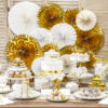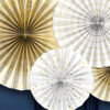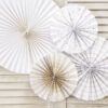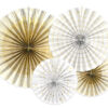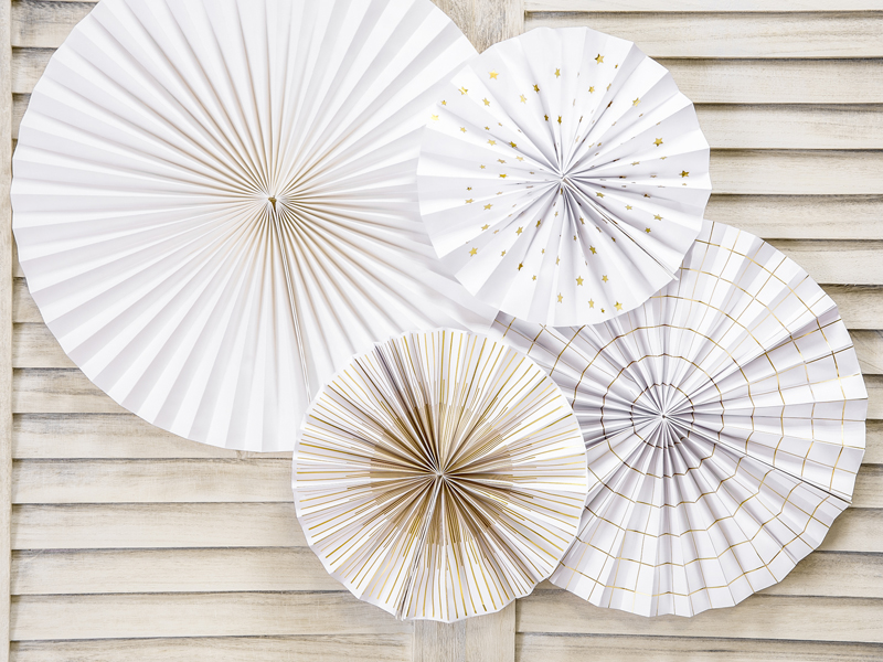 Rozety dekoracyjne, w kolorze białym ze złotymi wzorami, średnice po złożeniu ok. 23 cm (2 szt.), 32 cm (1 szt.) i 40 cm (1 szt.). (1 op. / 4 szt.)