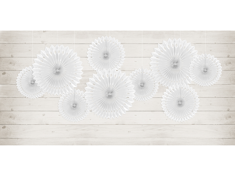 Rozety dekoracyjne wykonane z bibuły w kolorze białym, średnice po złożeniu ok. 20 cm, 25 cm i 30 cm. (1 op. / 3 szt.)