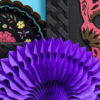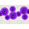 Rozety dekoracyjne wykonane z bibuły w kolorze fioletowym, średnice po złożeniu ok. 20 cm, 25 cm i 30 cm. Produkt wielokrotnego użytku. Montaż przy pomocy spinacza. (1 op. / 3 szt.)